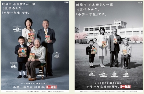 「小学一年生」が発行90周年になるにあたり、4世代家族に読み継がれていることを表現する企画でした。 4世代96才のおじいさんかおばあさんと小学校1年生になるひ孫がいる家族。いるのだろうか? 日本全国の役者事務所やモデル事務所、全国の知り合い、インターネットはもちろんのこと、地方新聞や地方紙を読みあさりました。 諦めなければいるんですね。今回ご出演いただいたご家族にたどり着いたときは、感動を覚えました!